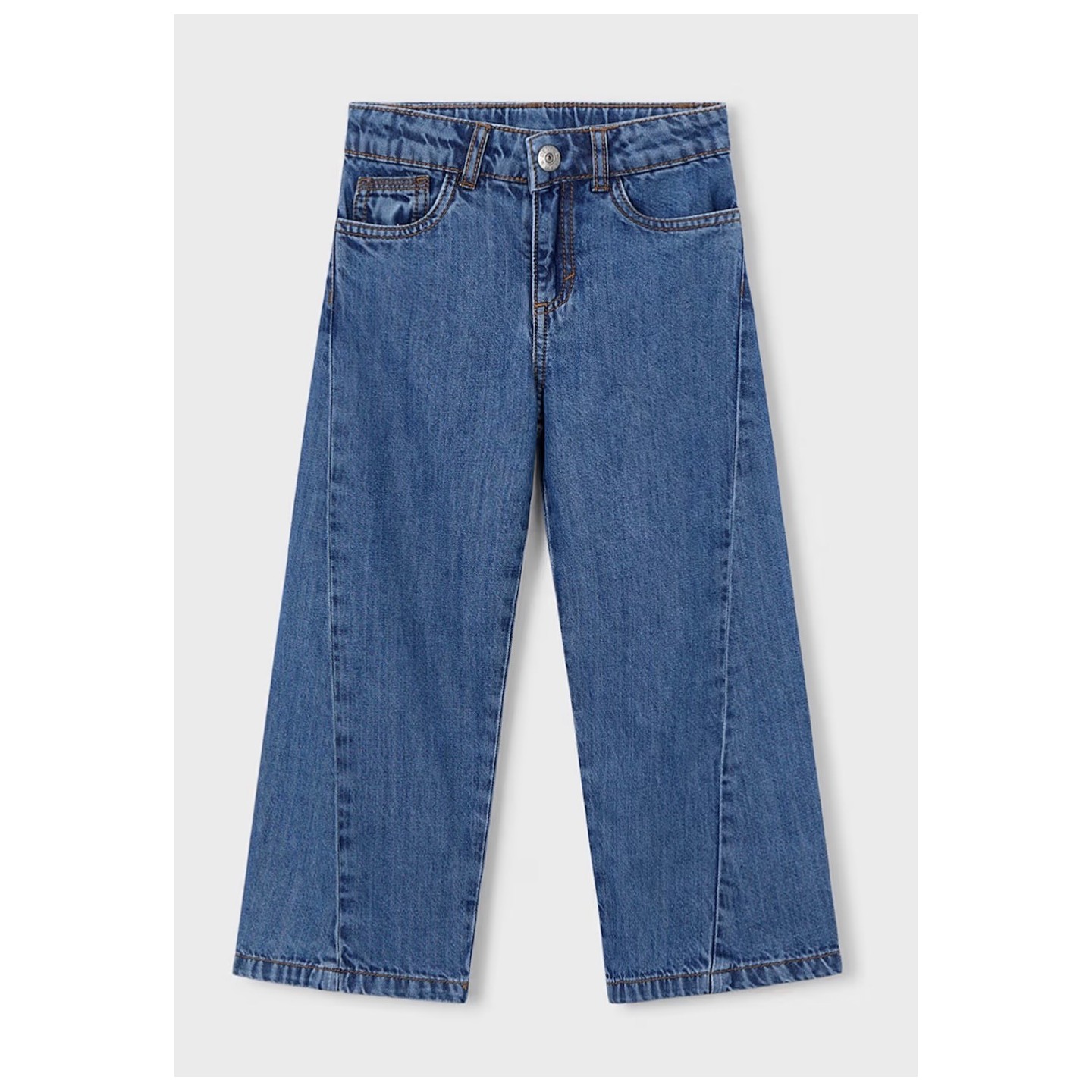 Jean en denim bleu signé Mayoral, à la coupe large et tendance. Taille confortable avec fermeture bouton et zip, passants pour ceinture et poches avant pratiques.