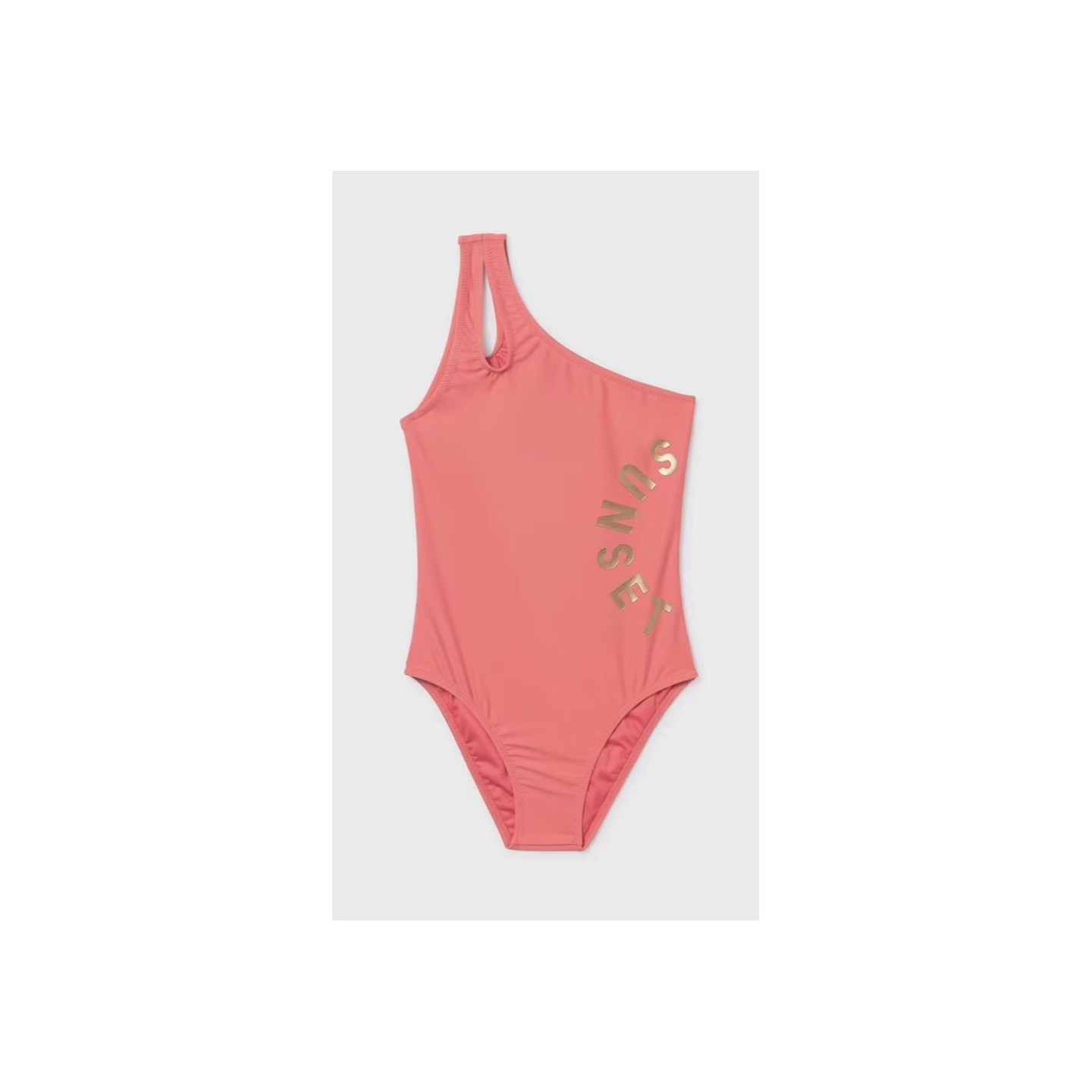 Maillot de bain une pièce asymétrique couleur corail avec une seule bretelle et découpe moderne à l’épaule. Design élégant avec inscription “SUNSET” dorée sur le côté, tissu extensible confortable